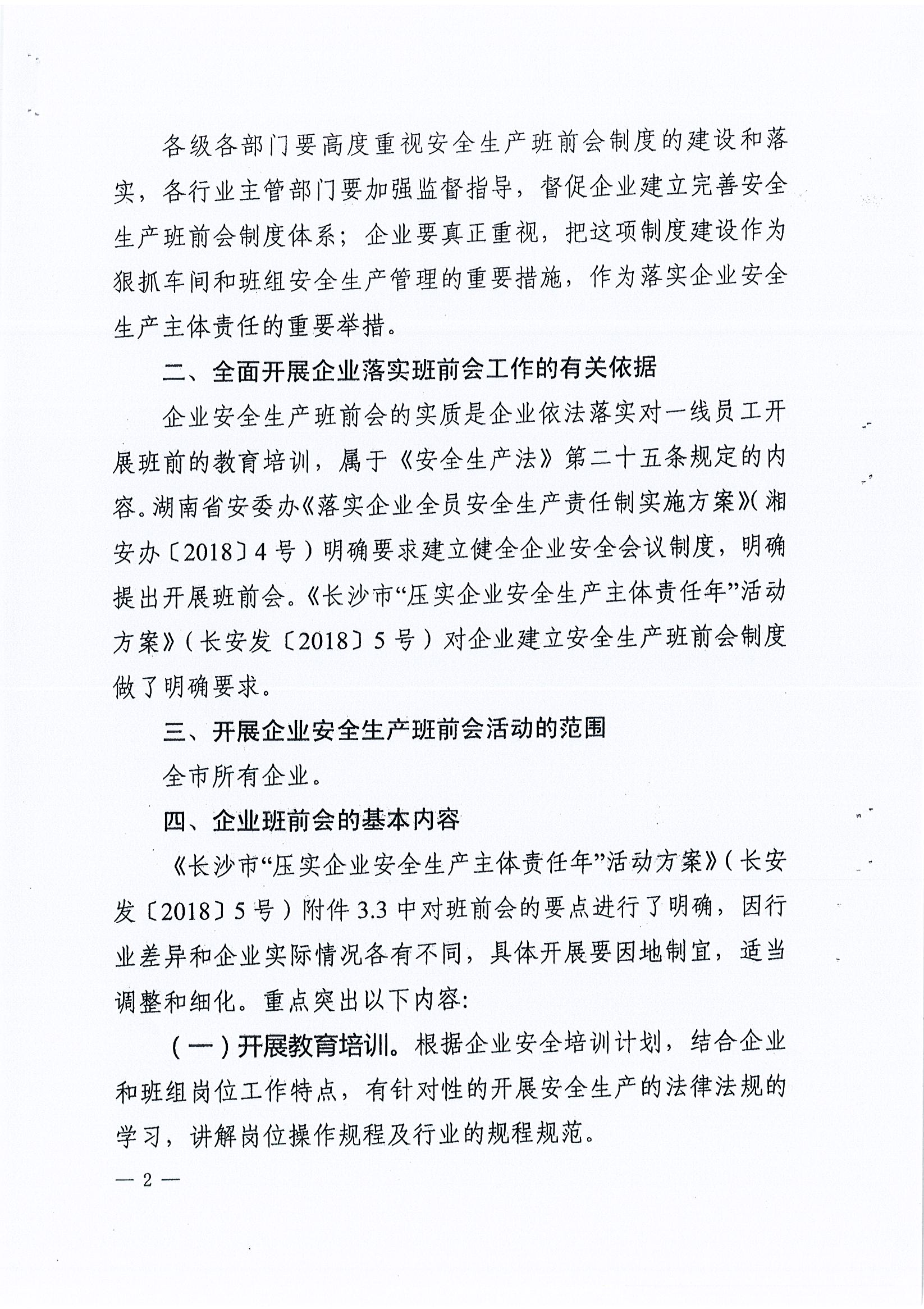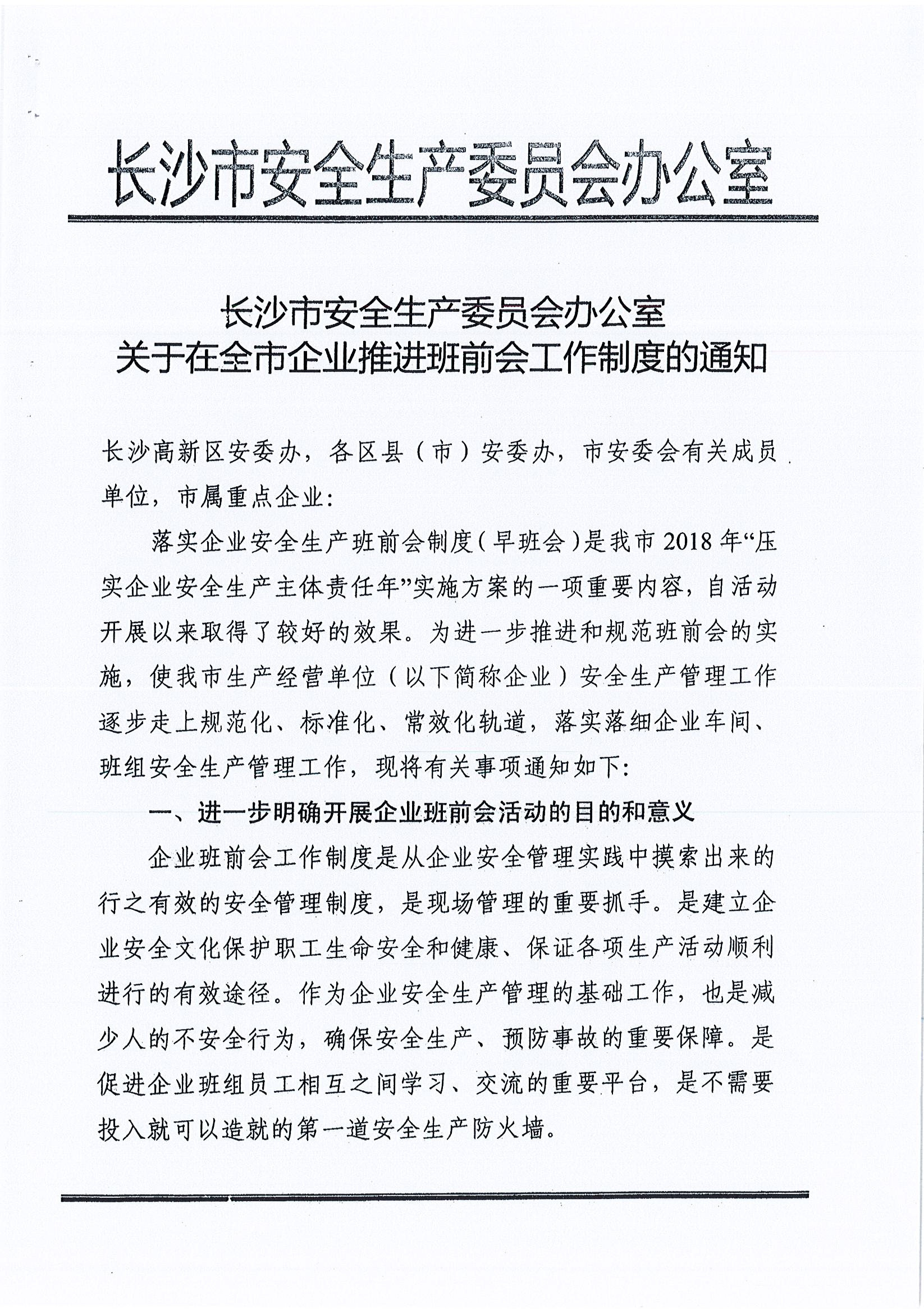 長沙市安全生產(chǎn)委員會辦公室關于在全市企業(yè)推進班前會工作制度的通知