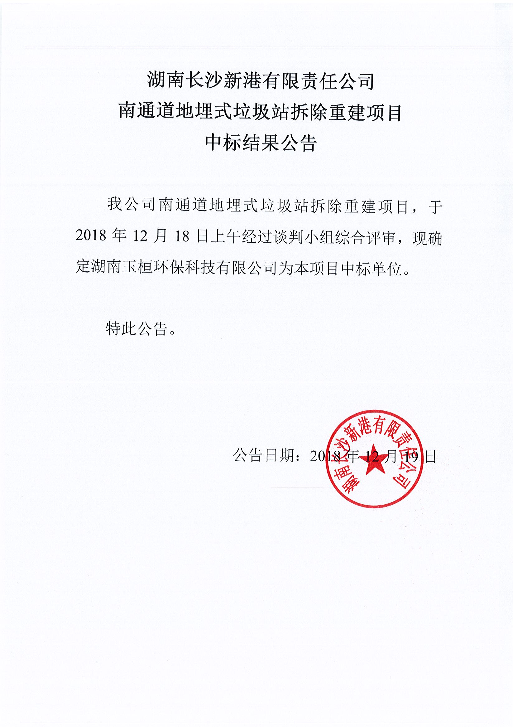 湖南長沙新港有限責(zé)任公司 南通道地埋式垃圾站拆除重建項(xiàng)目中標(biāo)公告