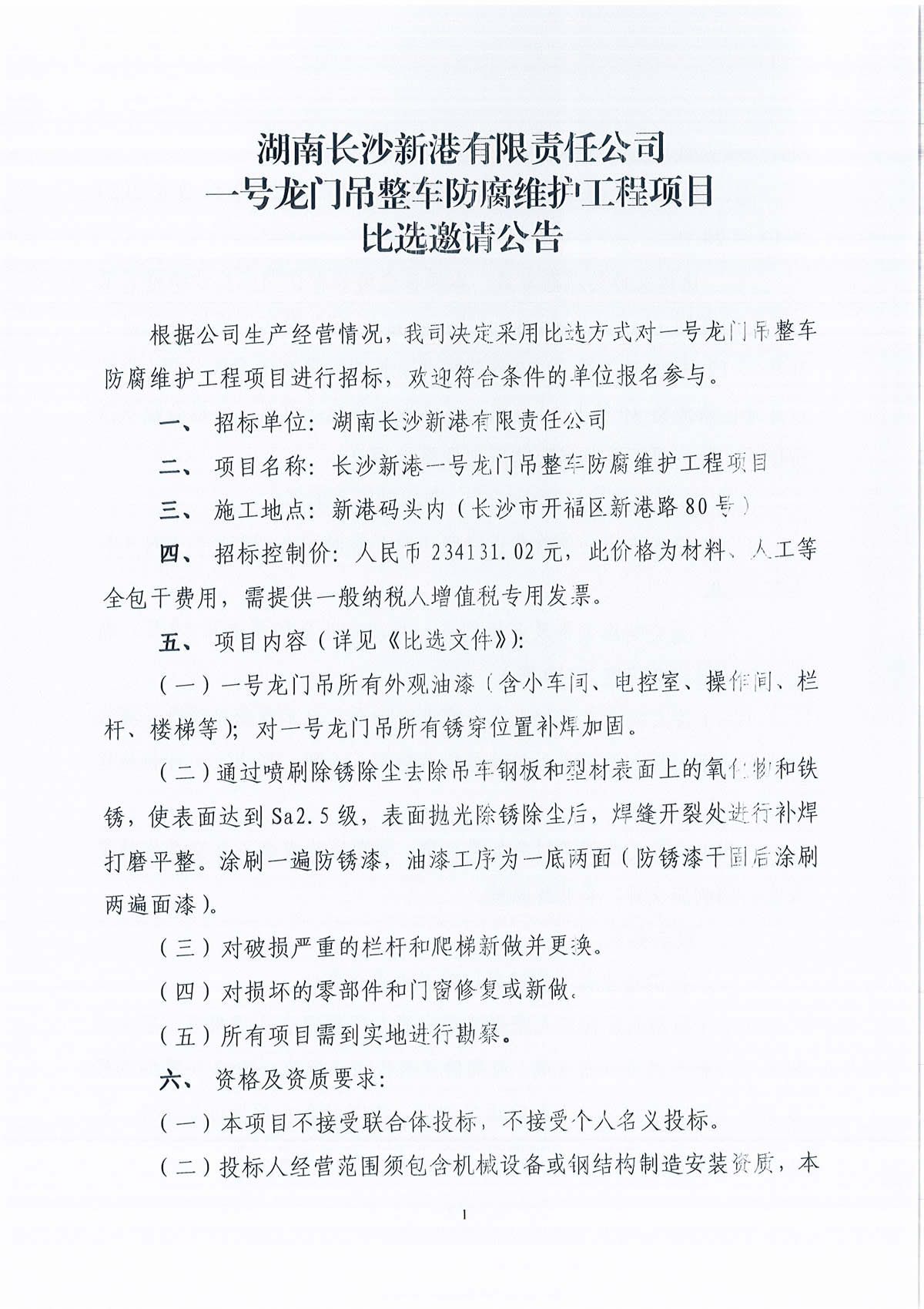 湖南長(zhǎng)沙新港有限責(zé)任公司一號(hào)龍門(mén)吊整車(chē)防腐維護(hù)工程項(xiàng)目比選邀請(qǐng)公告