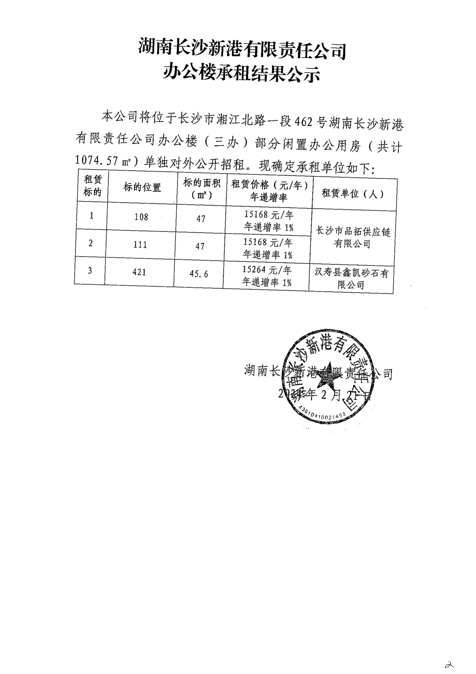 長沙新港辦公樓承租結(jié)果公示(108/111/421)
